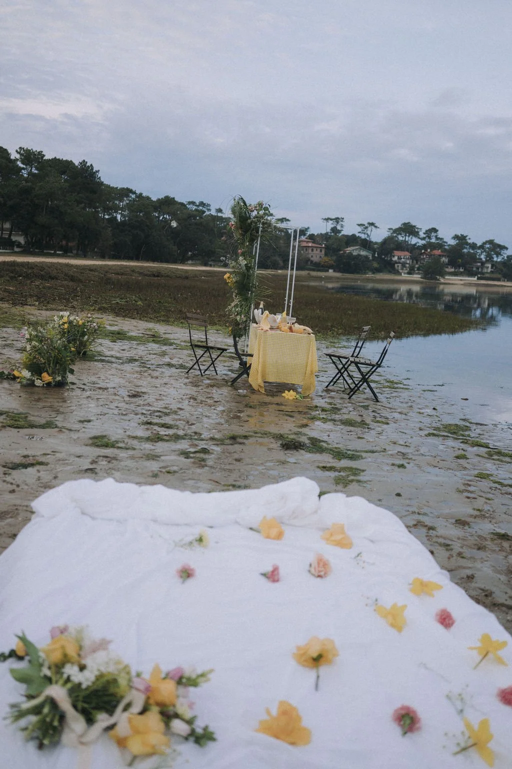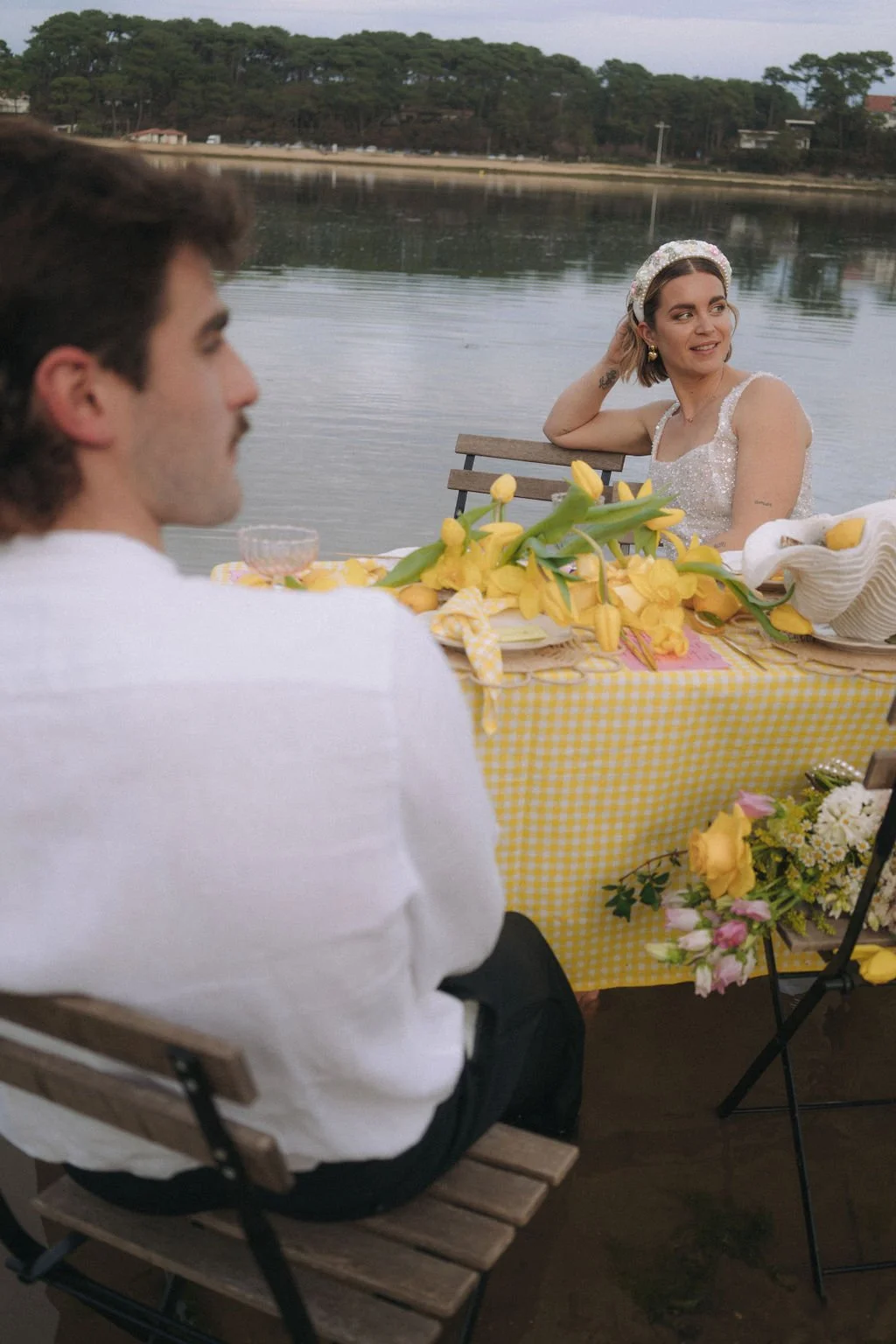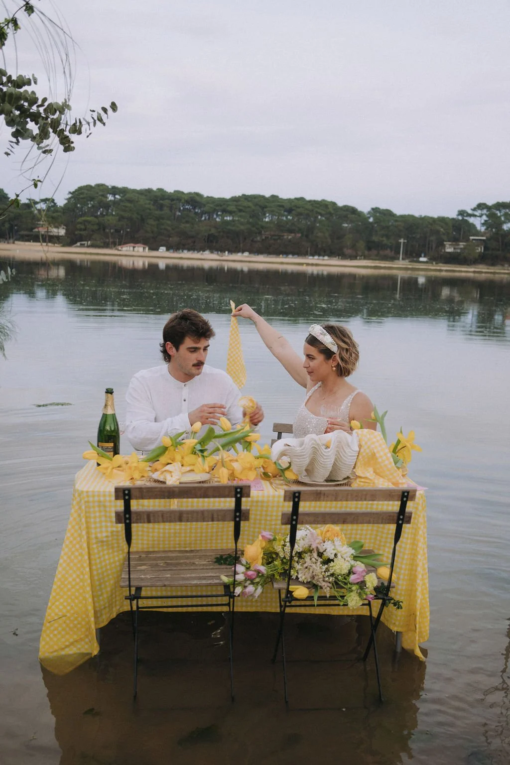 Les compositions florales et les accessoires soigneusement sélectionnés ont apporté une touche sophistiquée, renforçant le contraste entre la sérénité de l’eau et l’énergie des couleurs. Ce projet illustre parfaitement une vision moderne et rafraîchissante, idéale pour des mariages ou événements audacieux