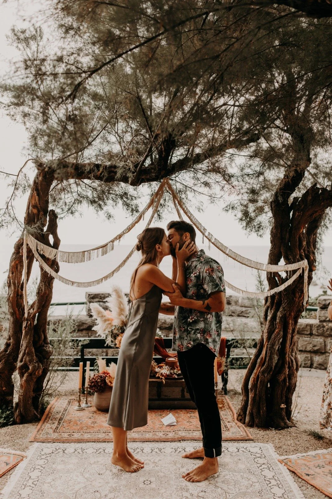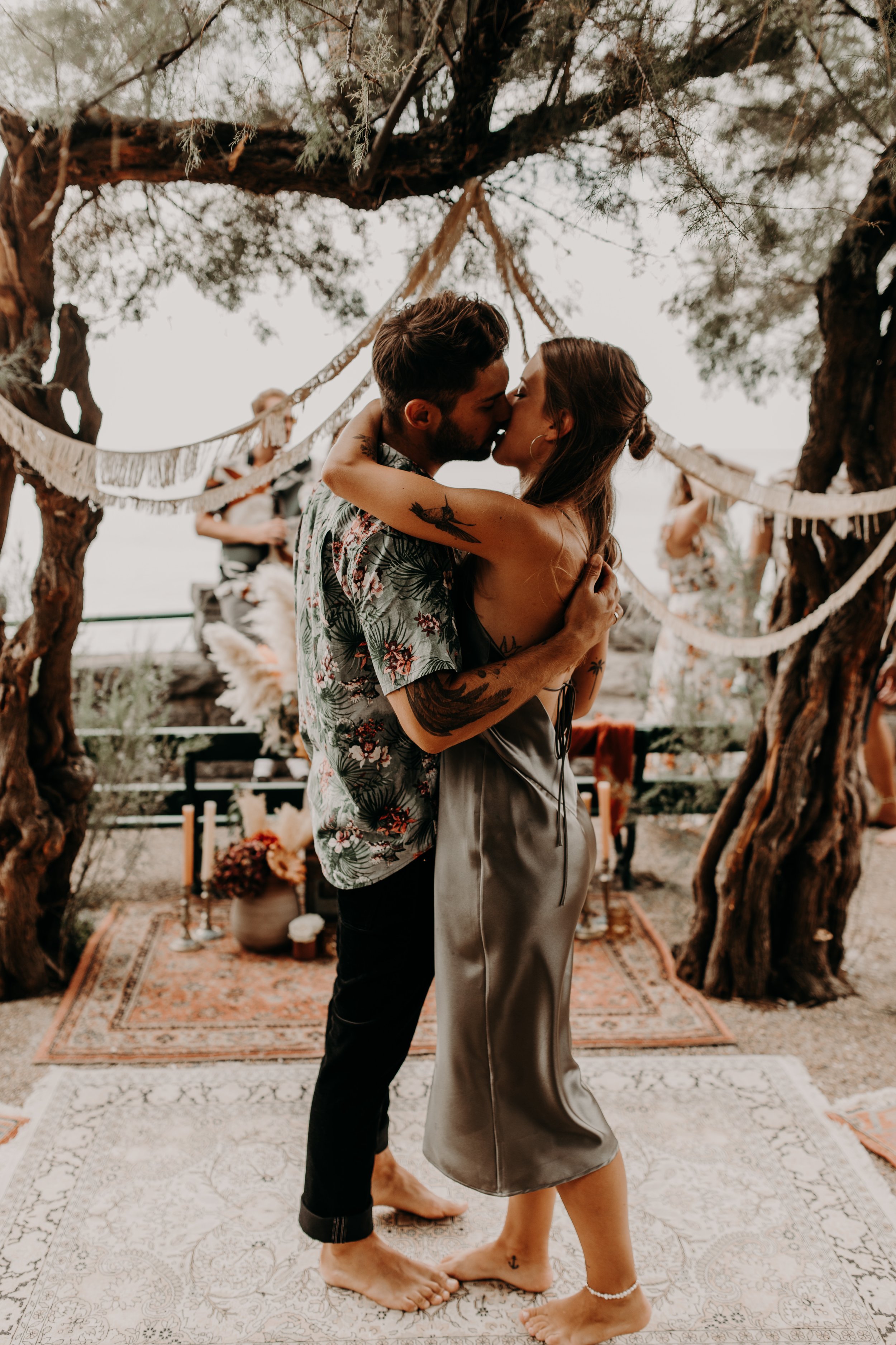 Un couple s'embrassant lors d'une cérémonie en plein air, entouré de décorations bohèmes et d'arbres.