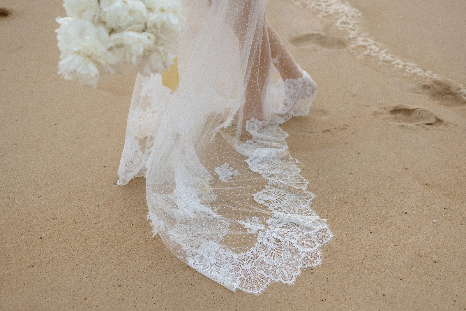 Bas d'une robe de mariée avec dentelle sur le sable, tenant un bouquet de fleurs blanches.