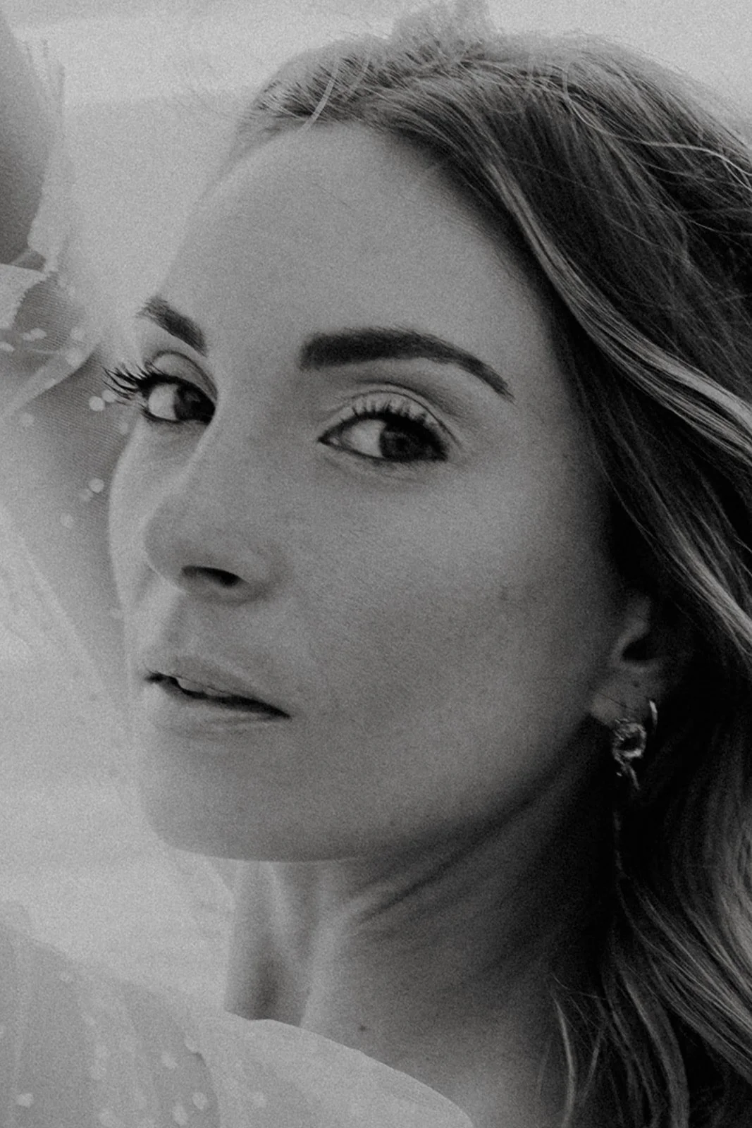 Portrait en noir et blanc d'une femme regardant vers la caméra, portant un bijou et vêtue d'un vêtement en tissu léger.