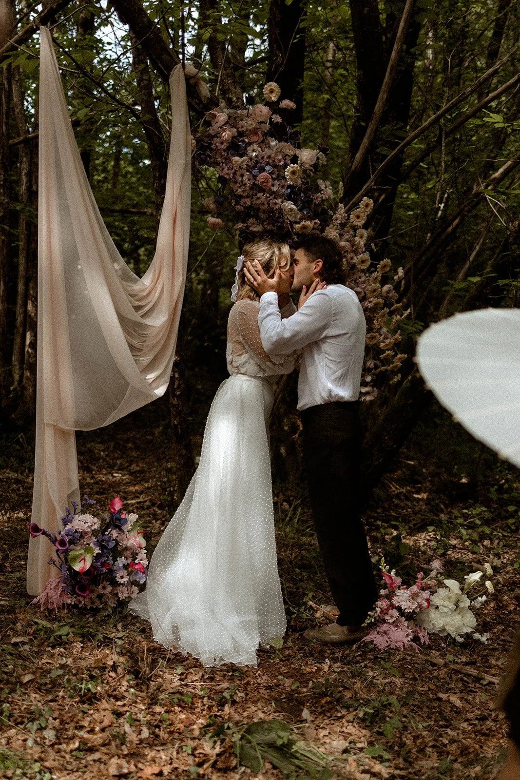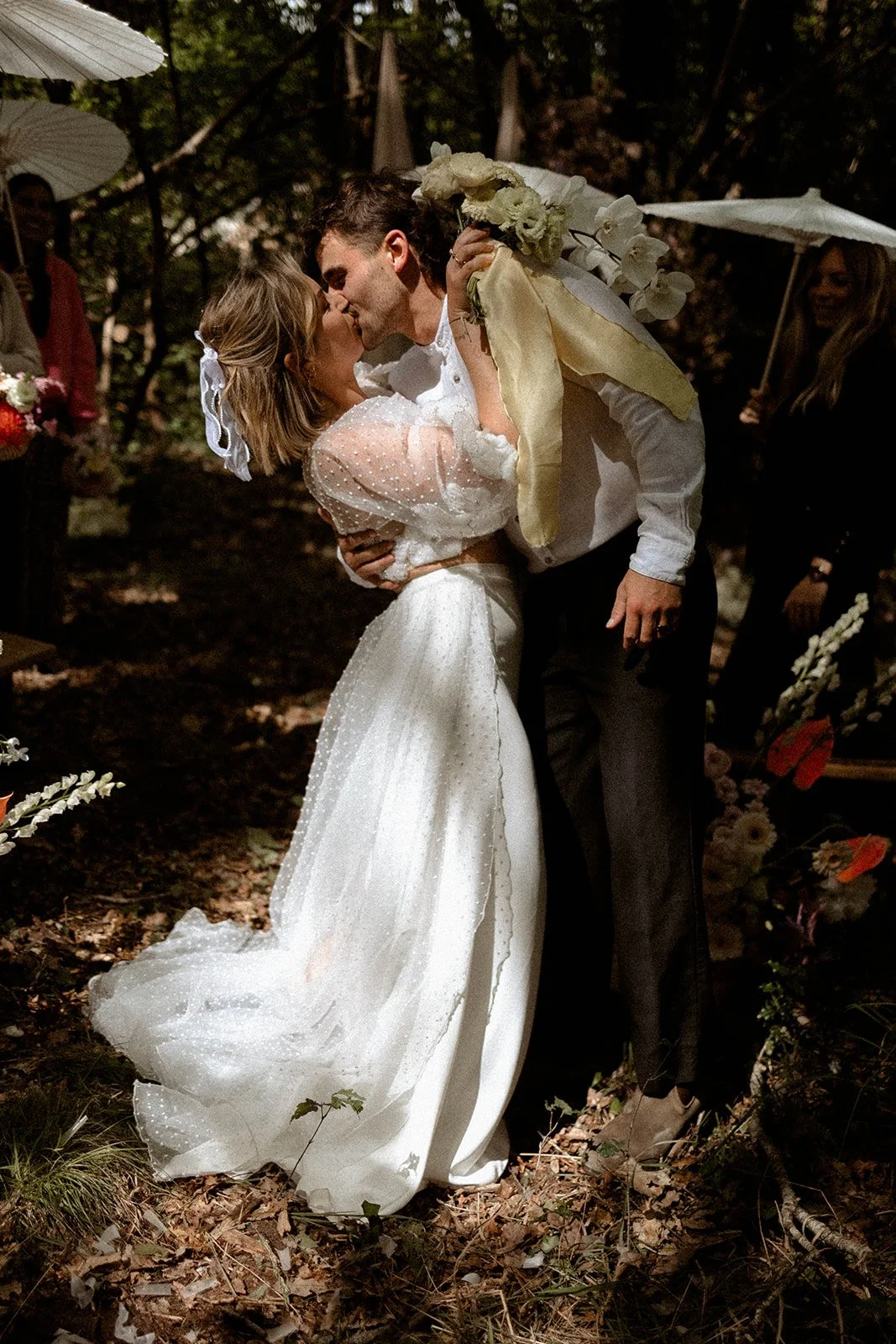 Un couple vêtue en tenue de mariage s'embrassant dans une forêt, entouré de fleurs et d'invités avec des parasols.