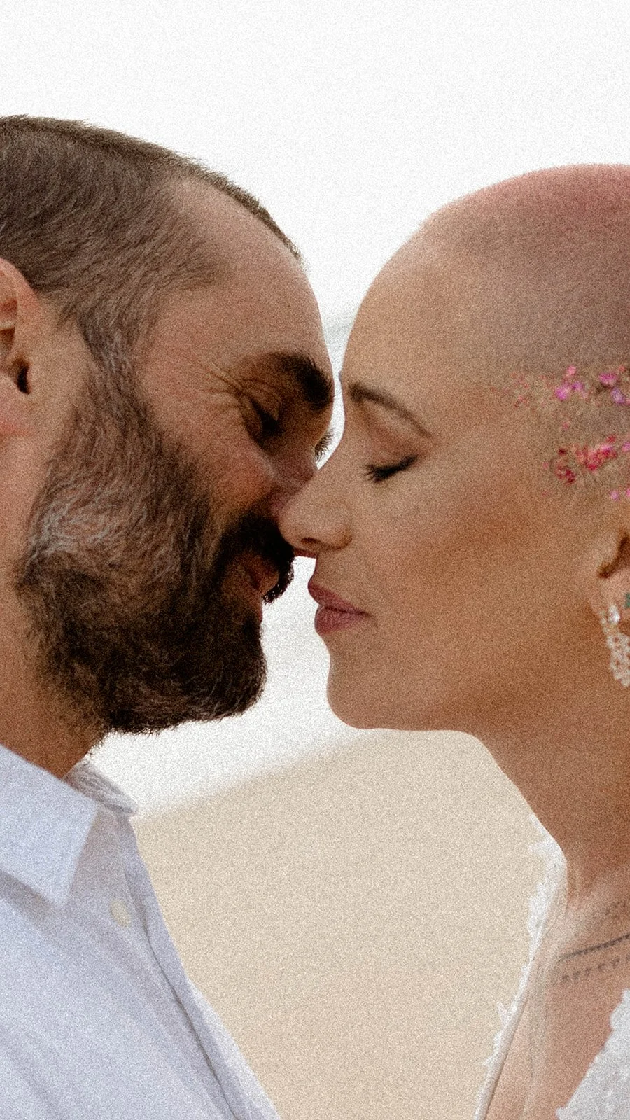 Un couple proche l'un de l'autre, se touchant le nez et souriant, l'homme a une barbe et la femme a des fleurs dans les cheveux.