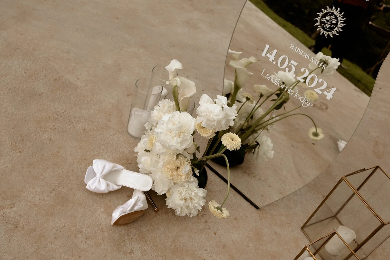 Des fleurs blanches, une paire de chaussures blanches, des bougies dans des photophores en verre, et un panneau en miroir avec des inscriptions, dont une date : 14.05.2024.