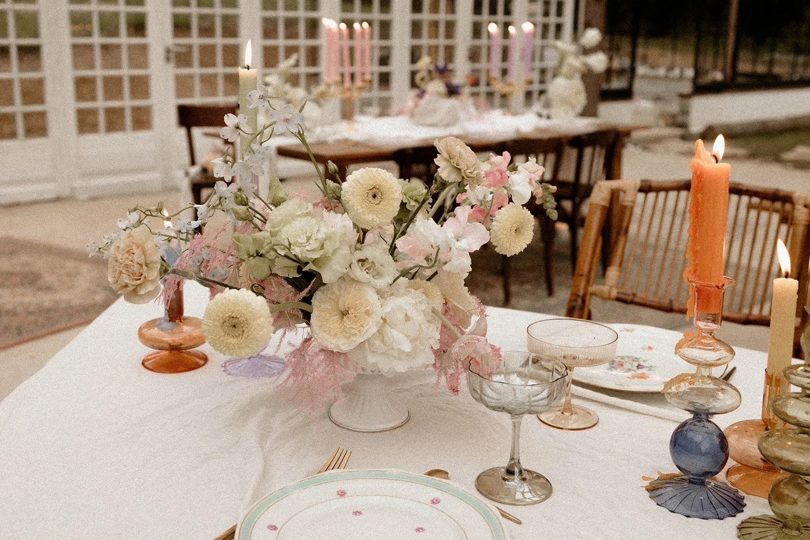 Une table élégamment dressée avec un bouquet de fleurs blanches et roses au centre, entouré de chandeliers et de verres en cristal. L'arrière-plan montre des portes vitrées et une autre table en bois décorée de chandelles roses et violettes.