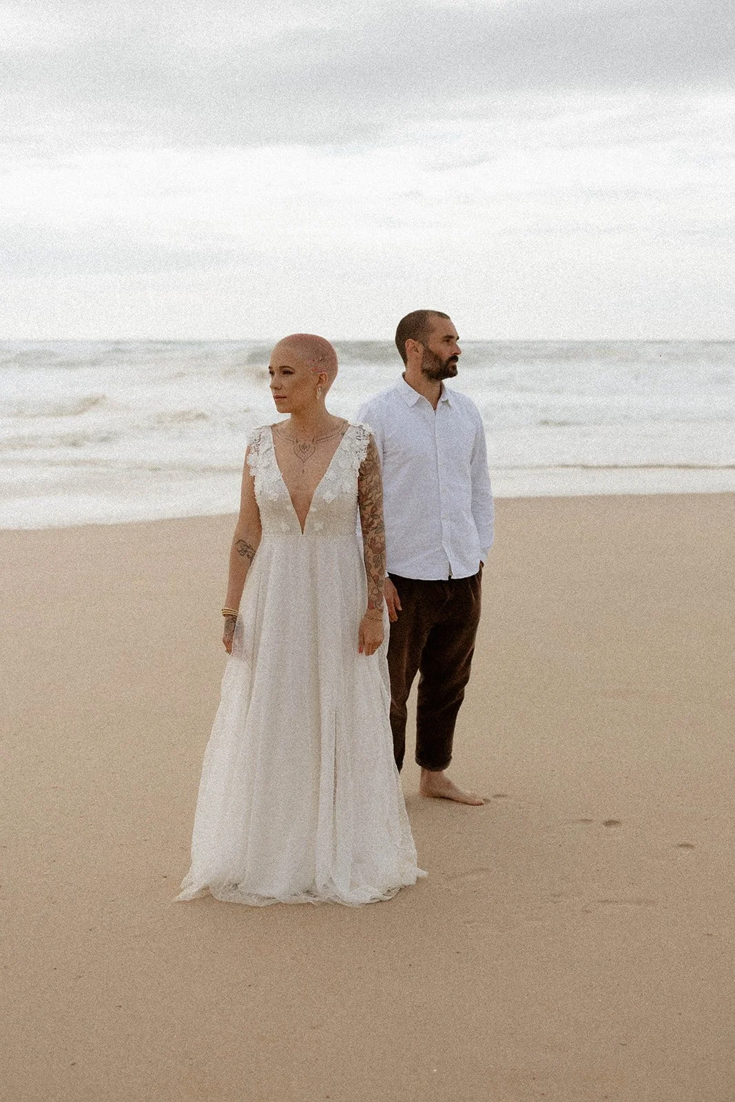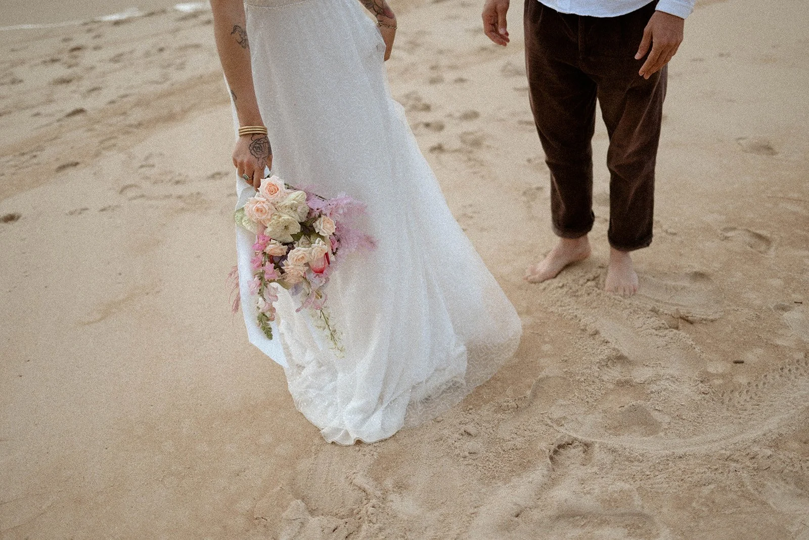 Mariée en robe blanche tenant un bouquet de fleurs sur la plage, accompagnée d'une personne en pantalon marron et chemise blanche, pieds nus dans le sable.