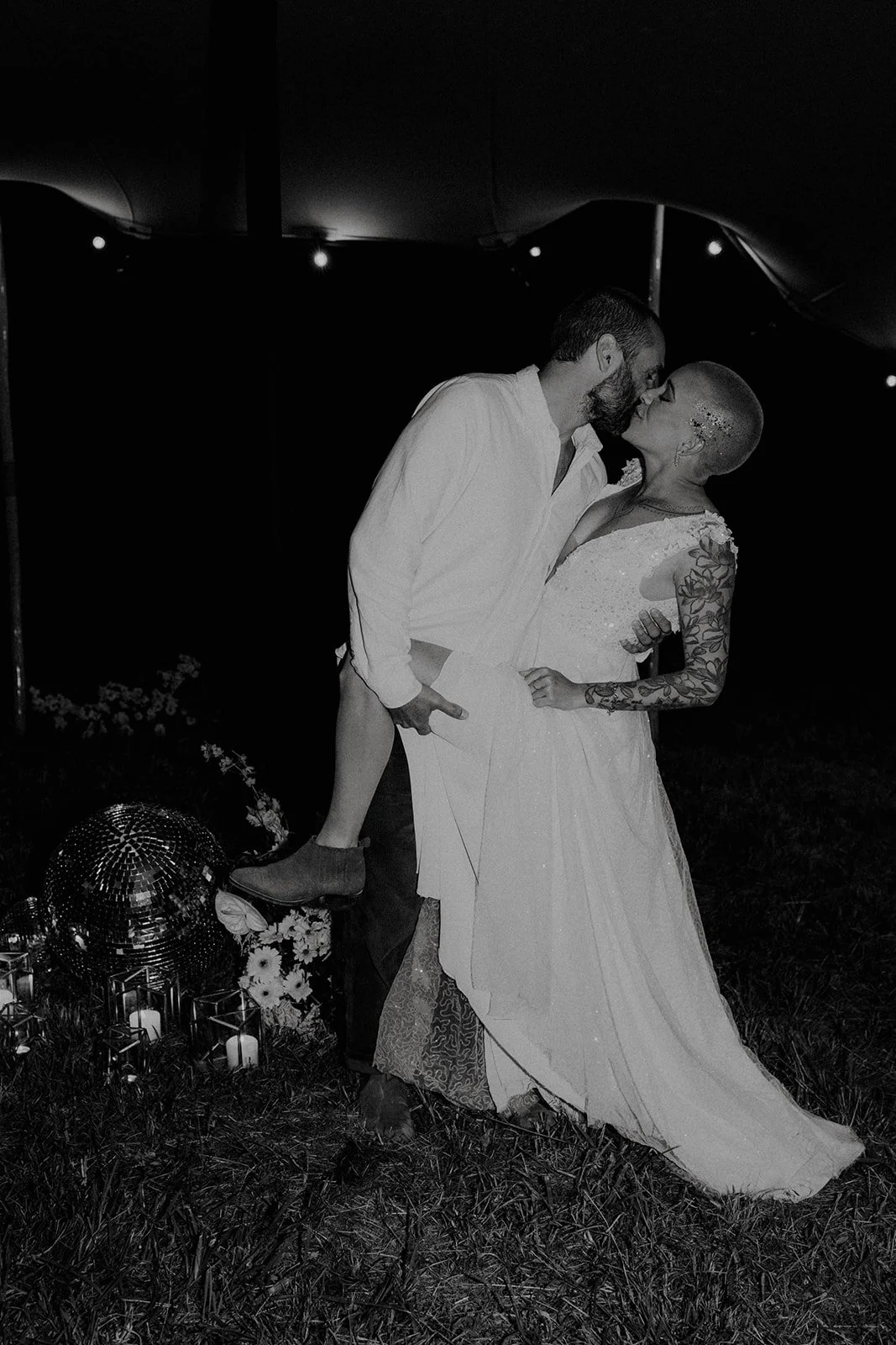 Couple s'embrassant lors d'un mariage, l'un en robe blanche, l'autre en chemise claire, entouré de décorations lumineuses et d'une boule disco.