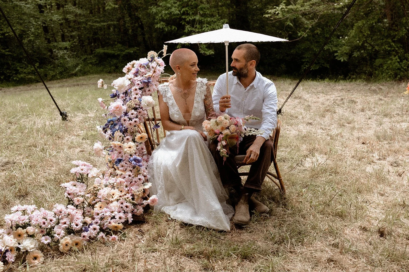 Un couple assis sur des chaises en plein air avec des fleurs autour d'eux. La femme porte une robe de mariée blanche et l'homme une chemise blanche. Ils sont sous un parasol.