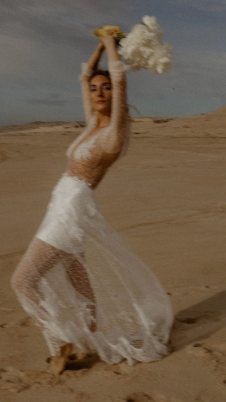 Femme en robe blanche transparente, tenant des fleurs blanches, dans un désert.