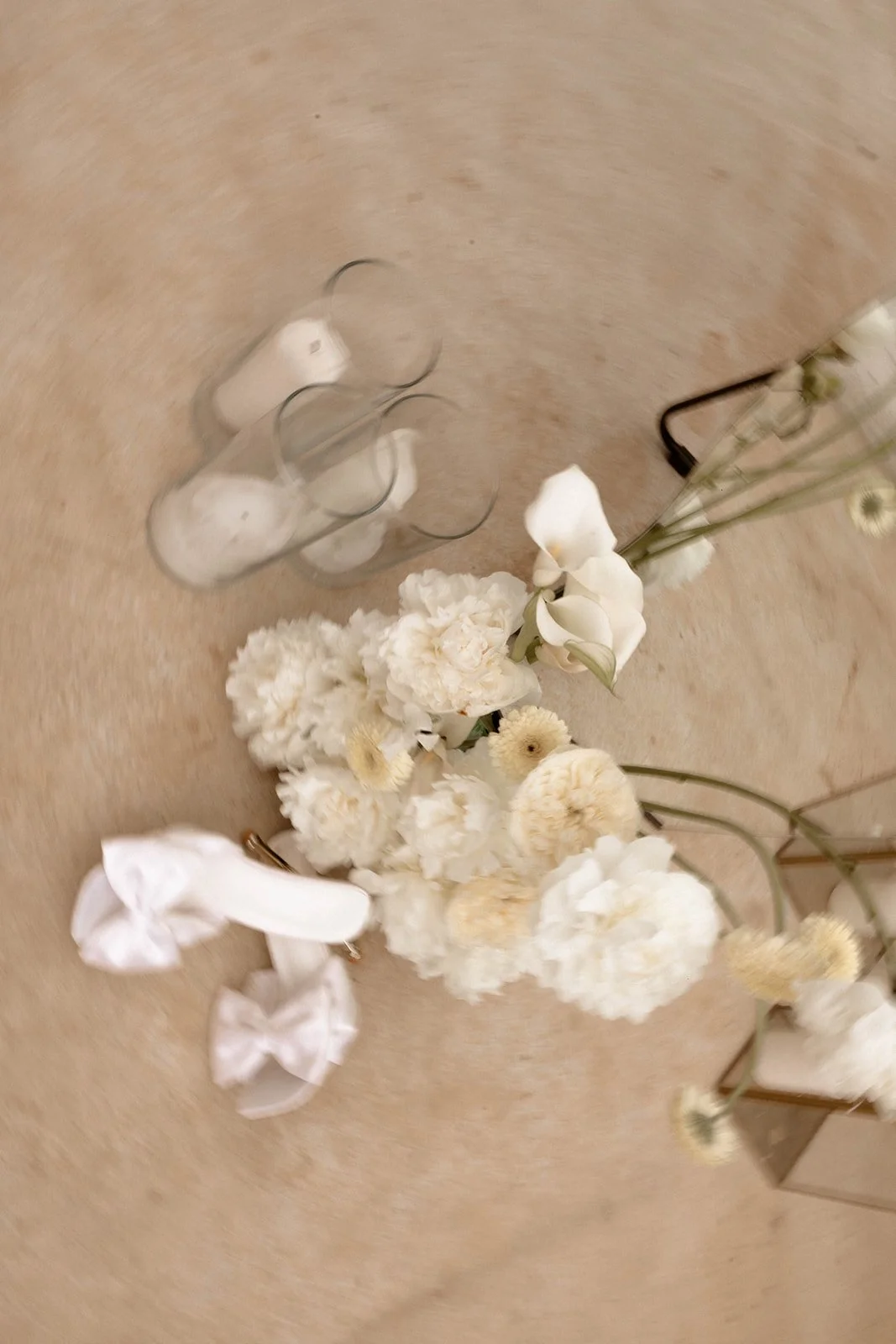 Bouquet de fleurs blanches sur le sol avec des bougies en verre et des chaussures à talons blanches avec un nœud.