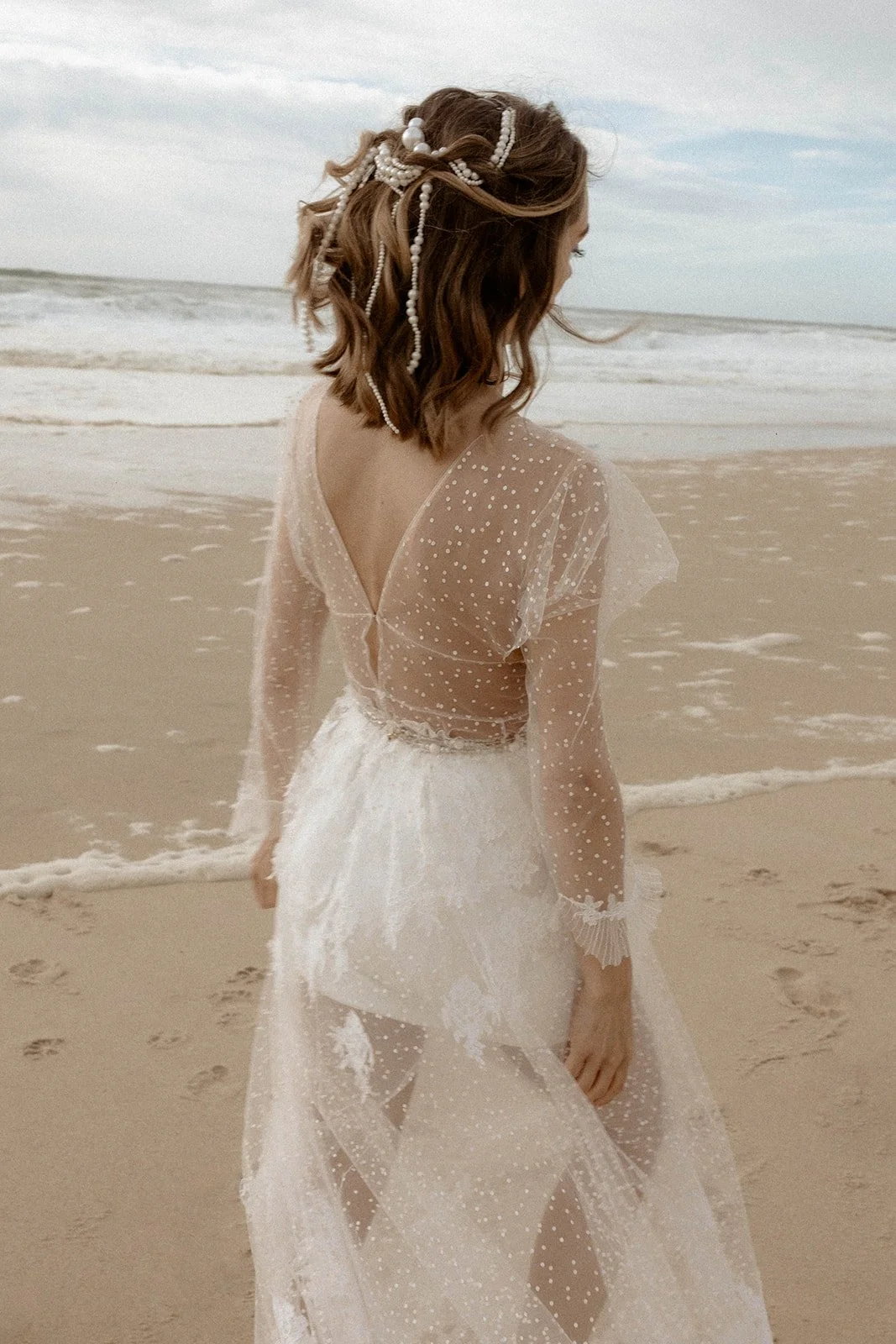 Une femme en robe de mariée sur une plage, dos tourné, avec des perles dans les cheveux.