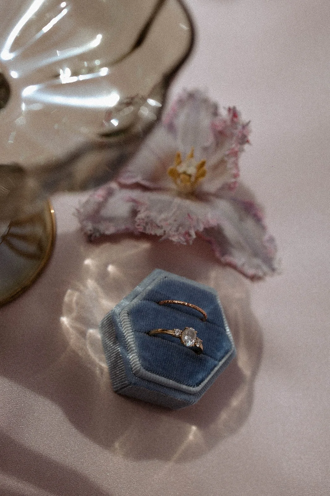 Deux bagues en or dans un écrin bleu avec une fleur blanche en arrière-plan.
