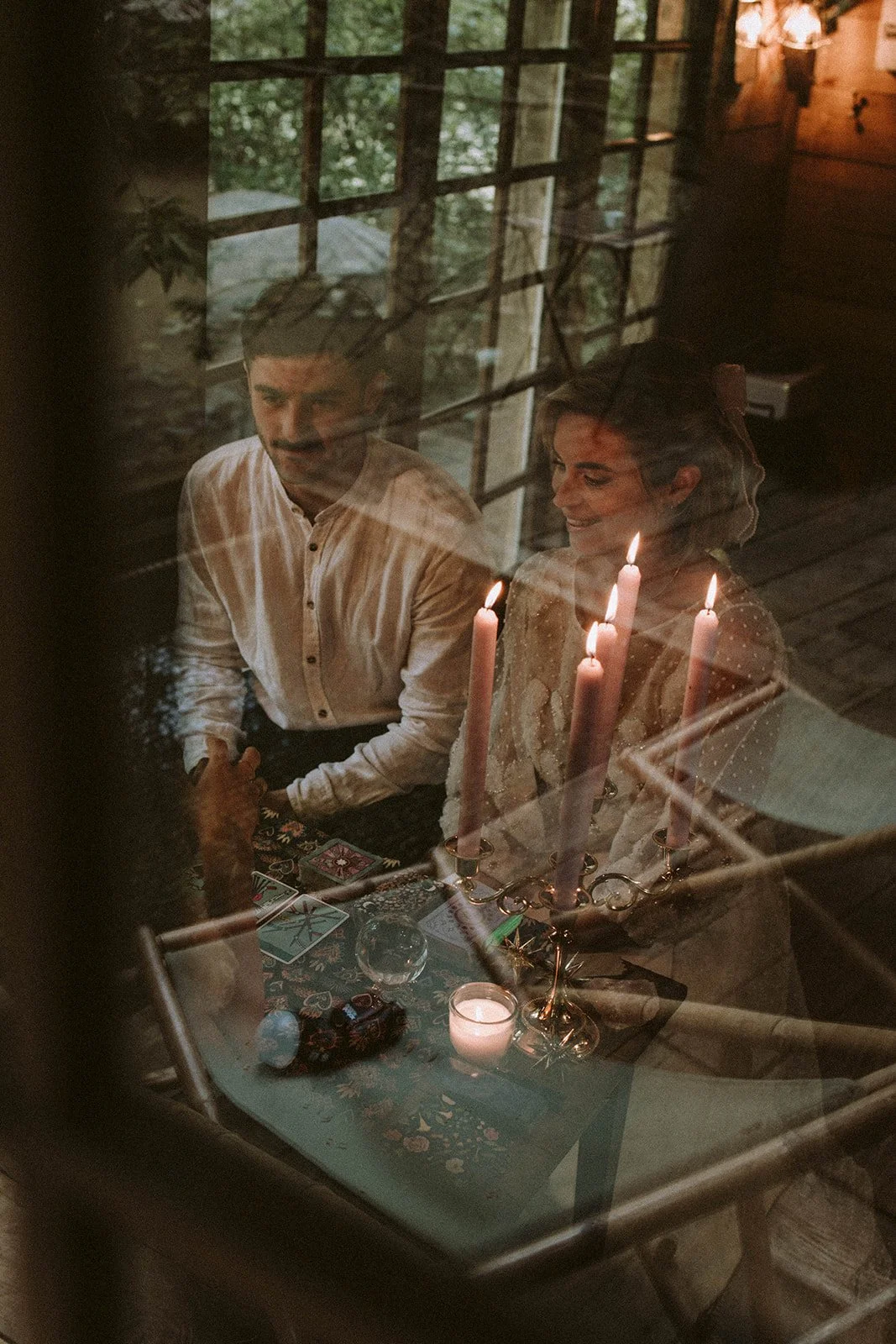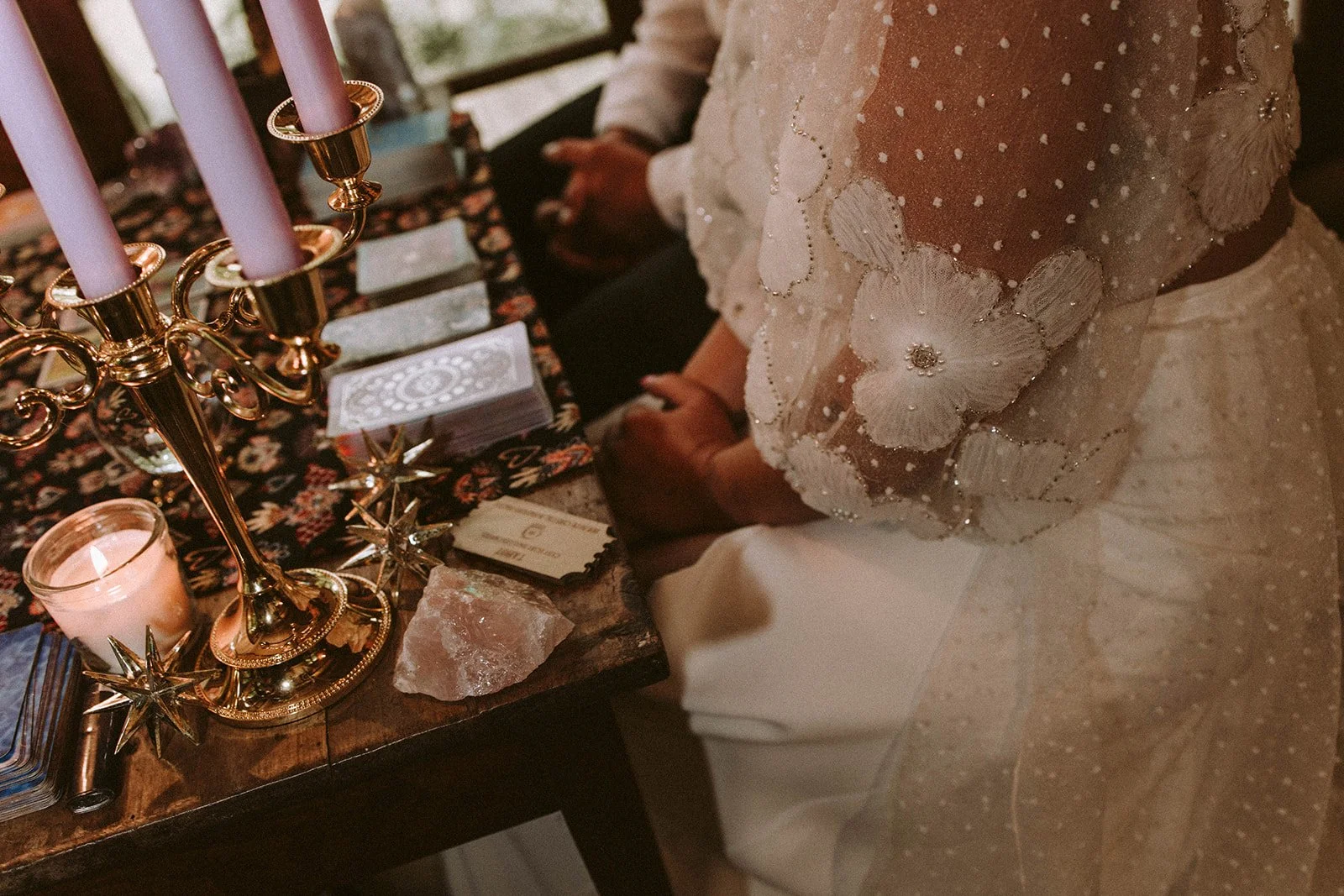 Décor de table avec chandelier doré, bougie allumée, cristaux, cartes posées sur une nappe ornée de motifs, et une personne en robe de dentelle avec des motifs de fleurs.