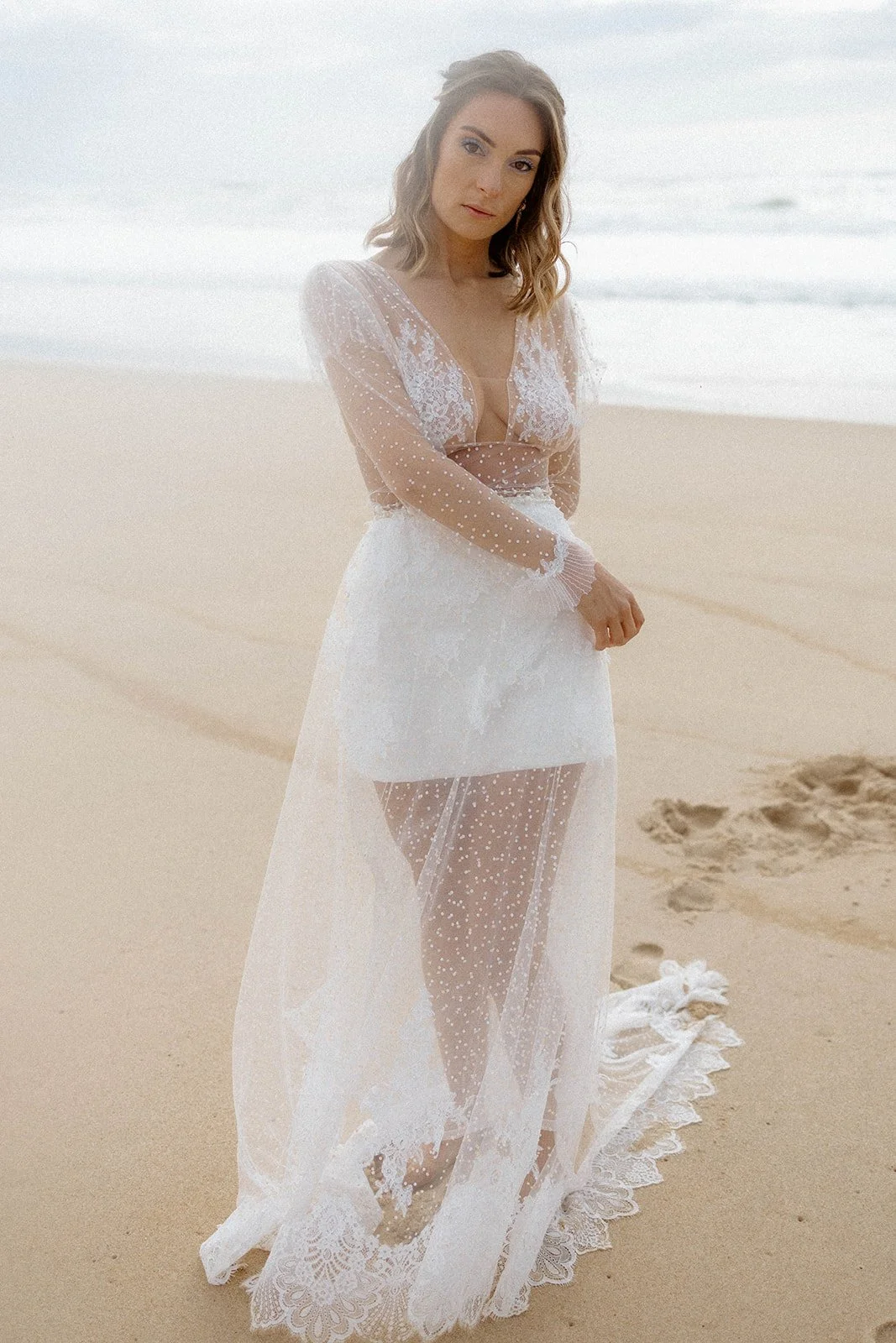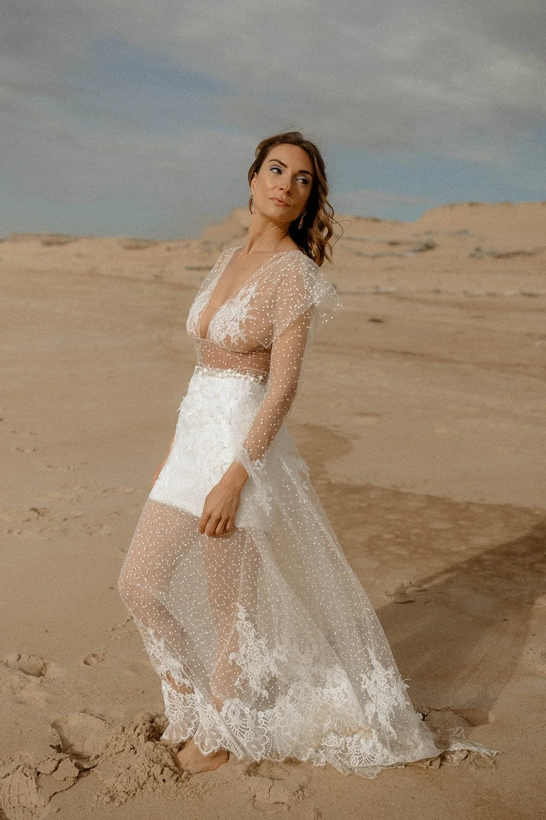 Femme en robe transparente sur une plage de sable, regardant au loin.