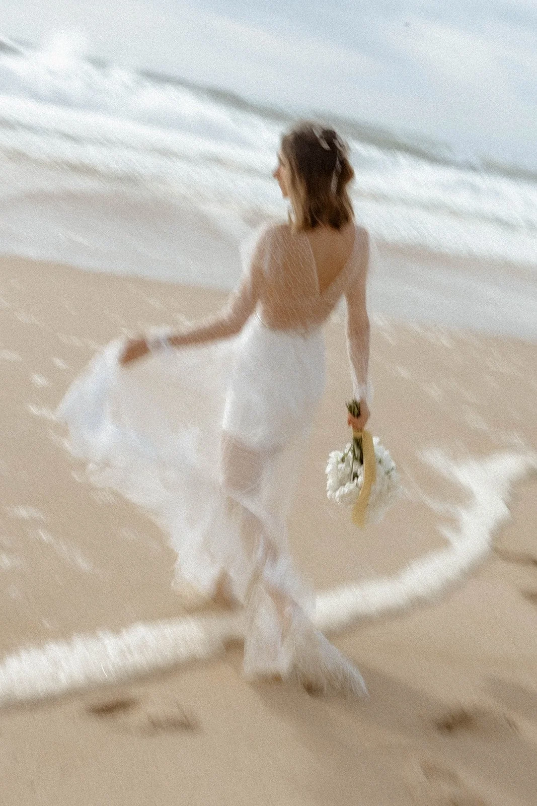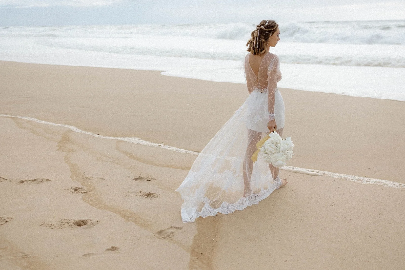 Femme en robe de mariée en dentelle sur une plage, regardant vers l'arrière.