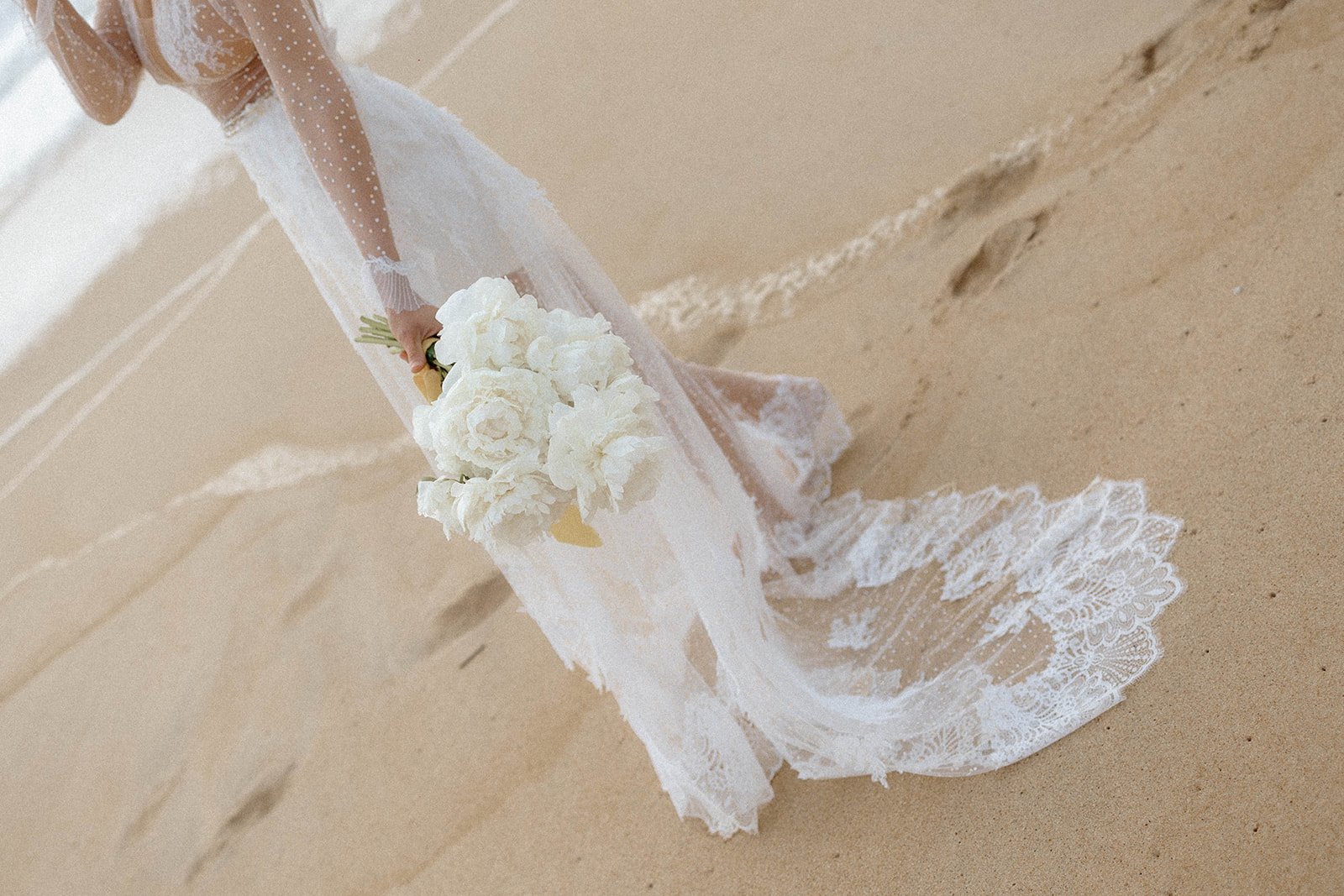 Mariée en robe de dentelle blanche tenant un bouquet de fleurs blanches sur une plage de sable.