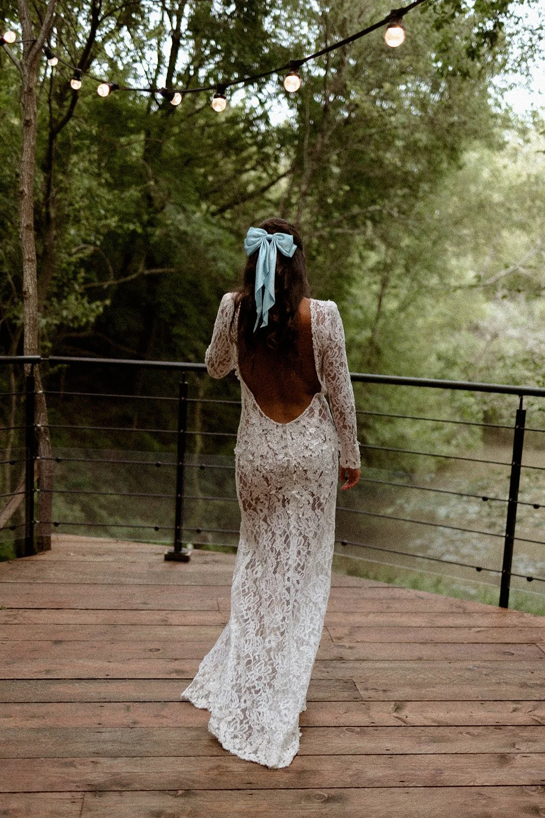 Une femme en robe blanche en dentelle avec un ruban bleu dans les cheveux, debout sur une terrasse en bois entourée d'arbres, sous des guirlandes lumineuses.