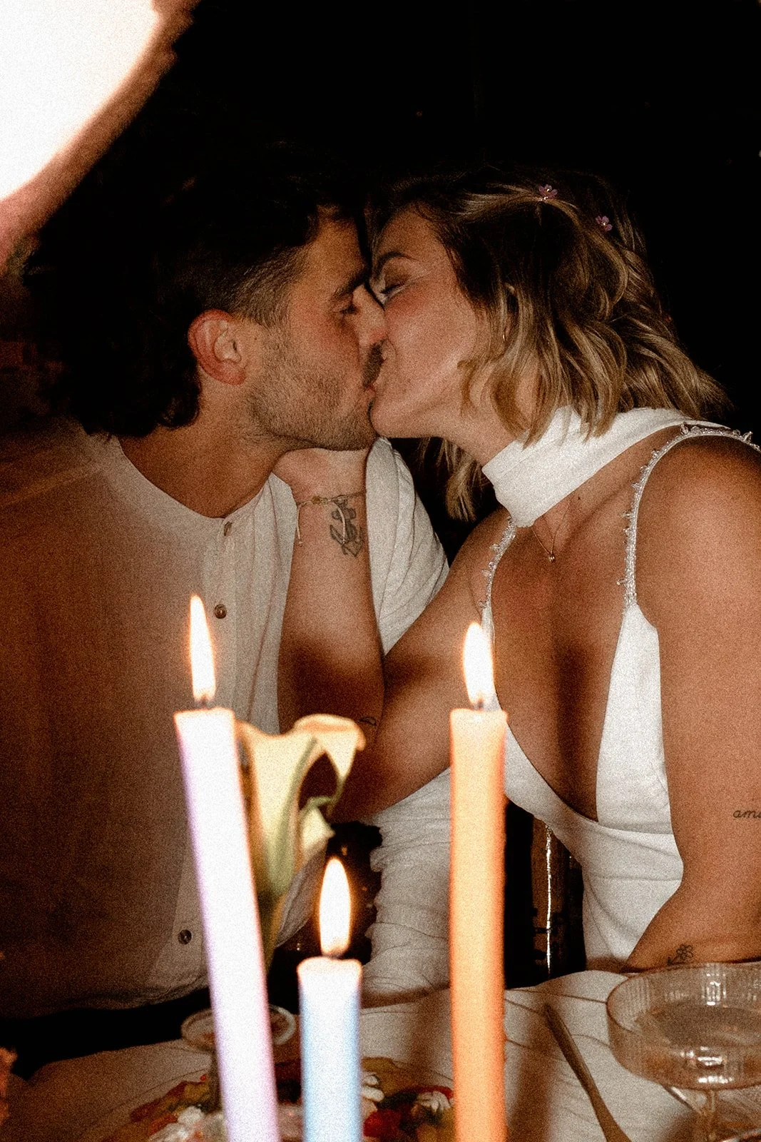 Un couple s'embrassant à une table illuminée par des bougies colorées.