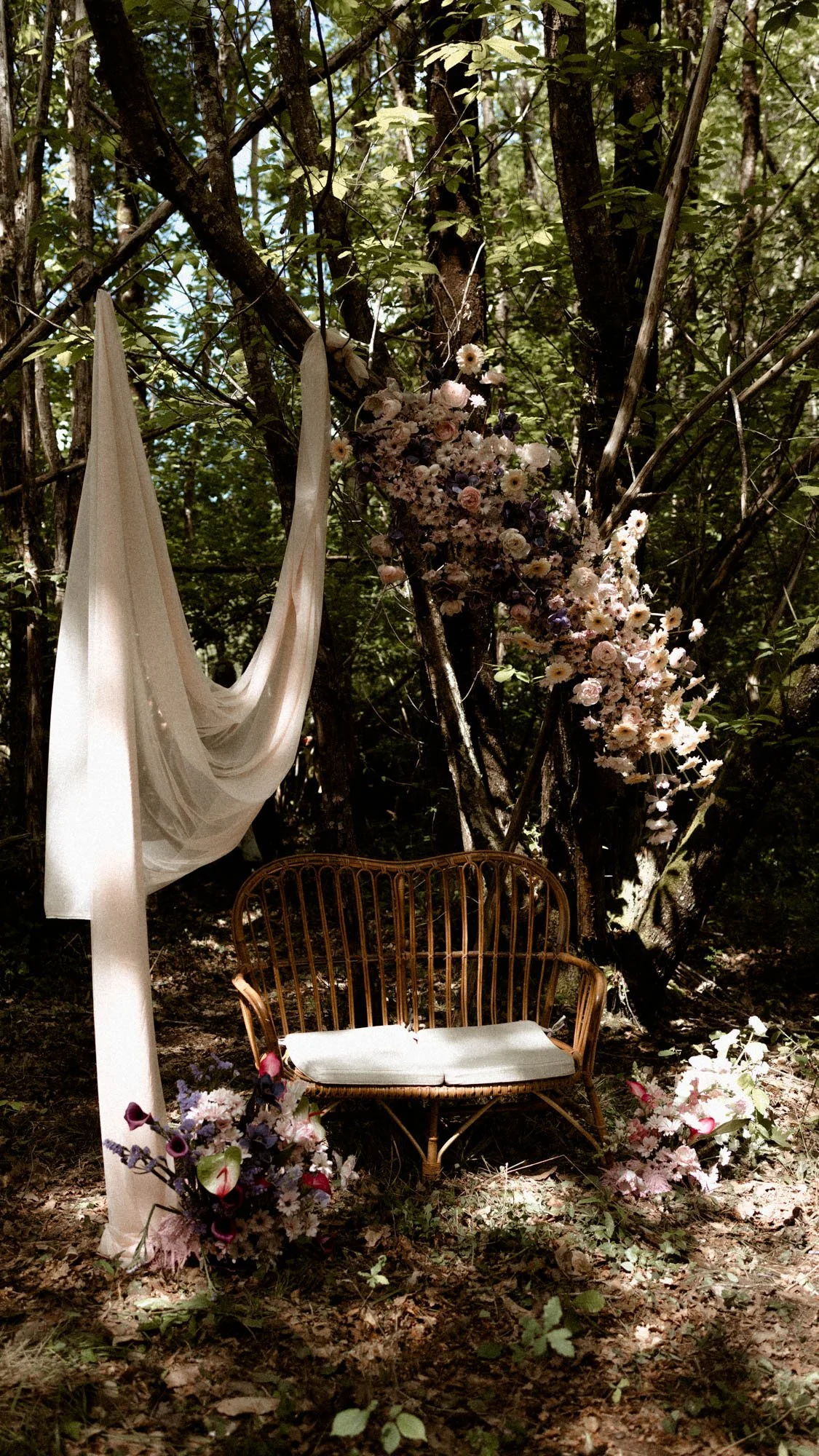 Banc en bois avec coussin blanc, drapé de tissu beige, arrangement floral rose et violet au milieu d'un bois verdoyant.