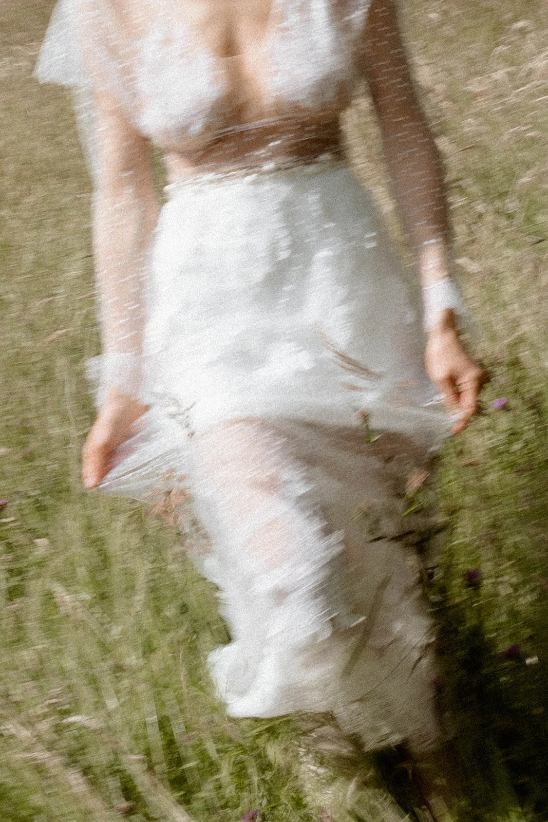 Jeune femme en robe de mariée vue de dos, en noir et blanc, dans un paysage champêtre.