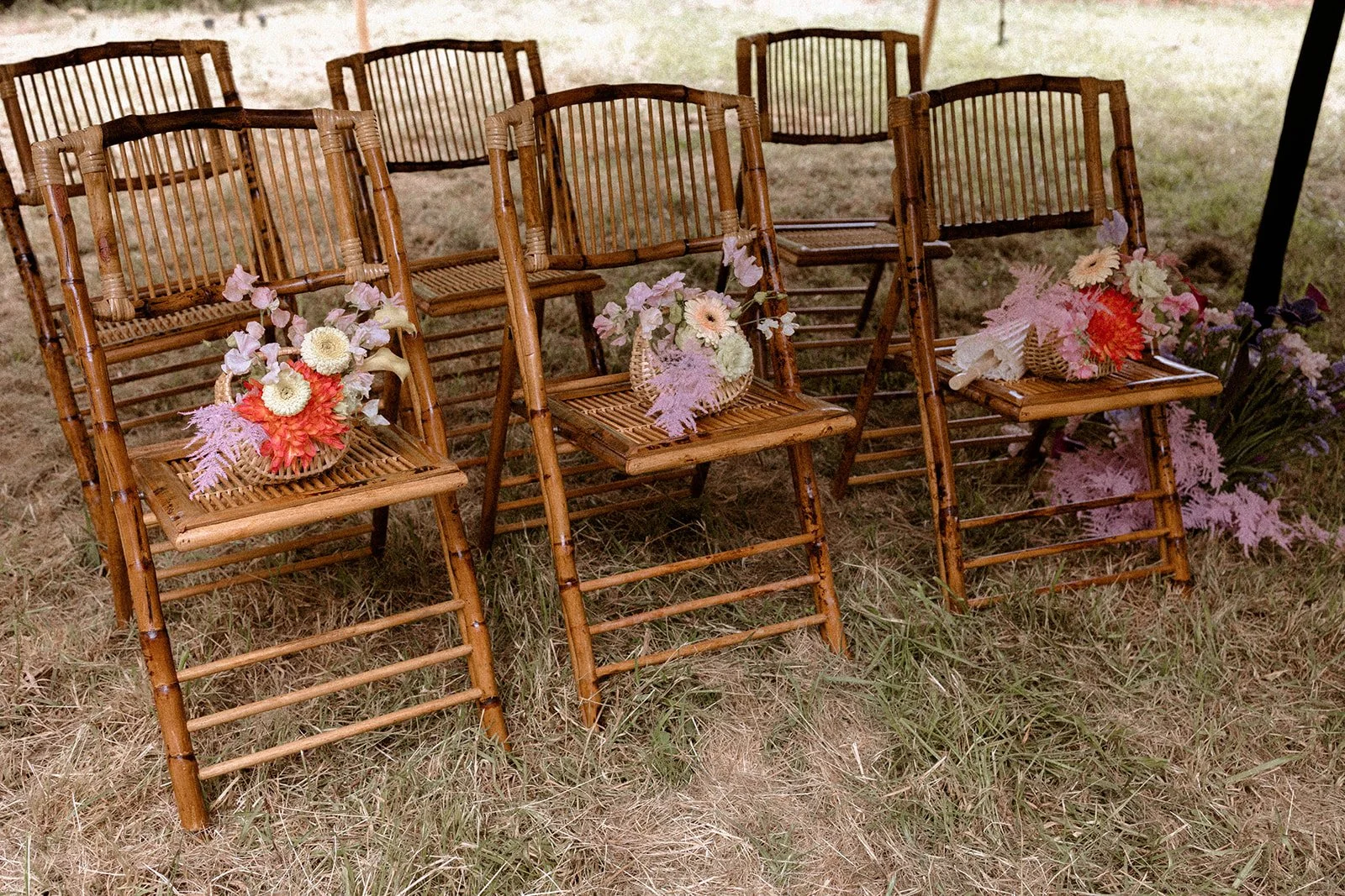 Chaises en bois avec bouquets de fleurs sur l'herbe.