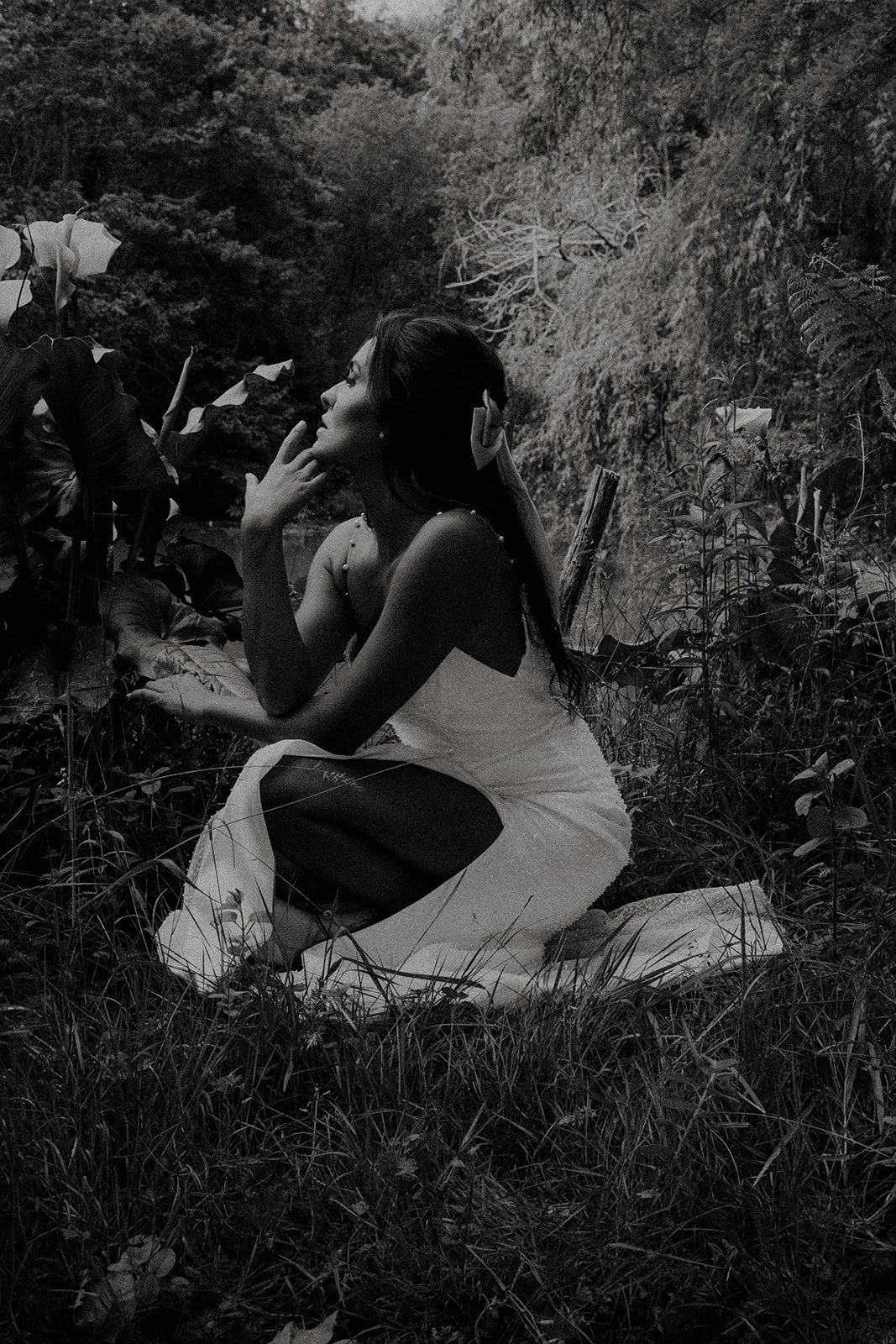Une femme en robe blanche est assise dans un paysage naturel verdoyant, entourée de végétation luxuriante.