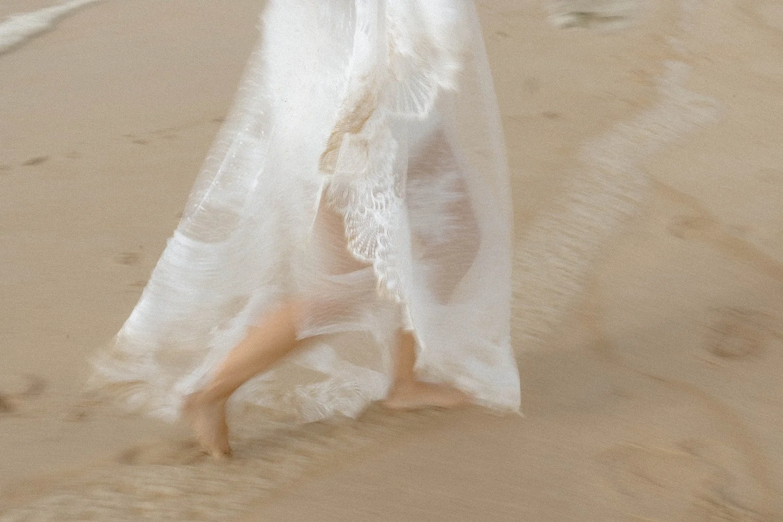 Jambes d'une personne marchant sur une plage avec une robe en dentelle blanche flottante.