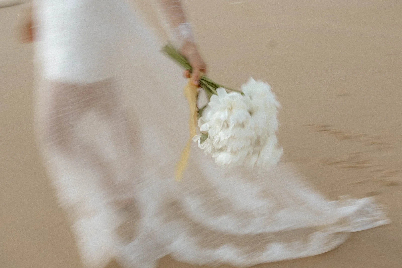 Une personne tenant un bouquet de fleurs blanches sur la plage, avec une robe floue en arrière-plan.