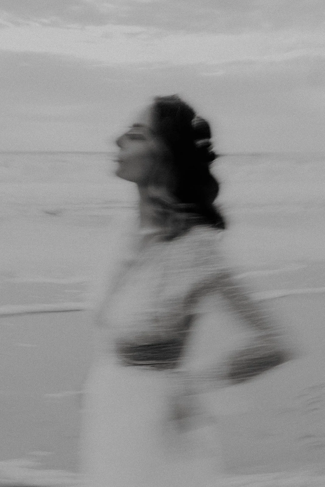 Femme en robe blanche floue sur la plage tenant un bouquet