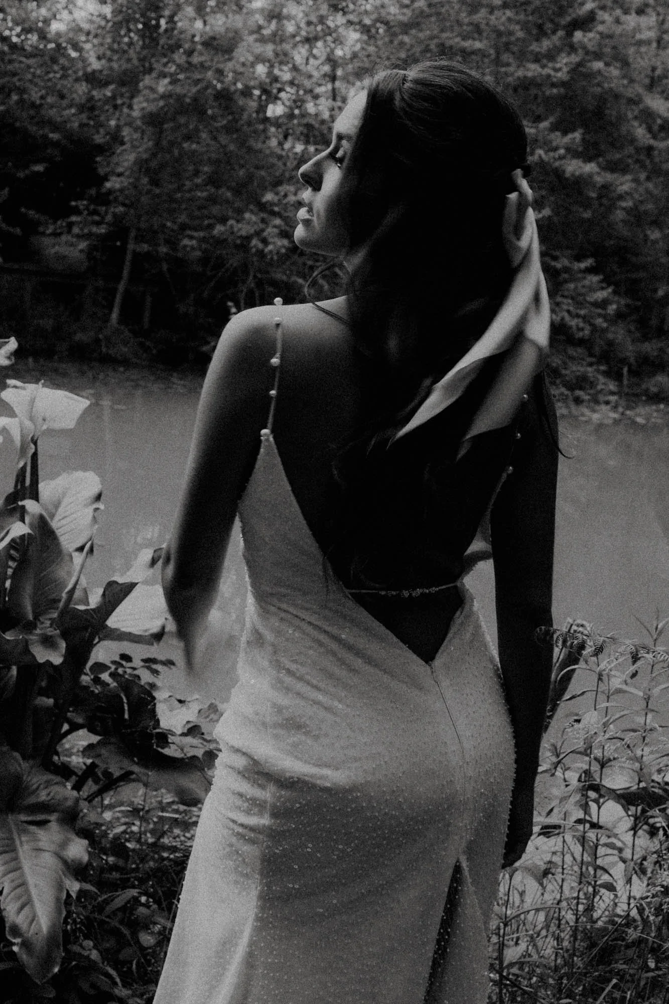 Femme en robe de dos près d'un lac avec végétation en noir et blanc.