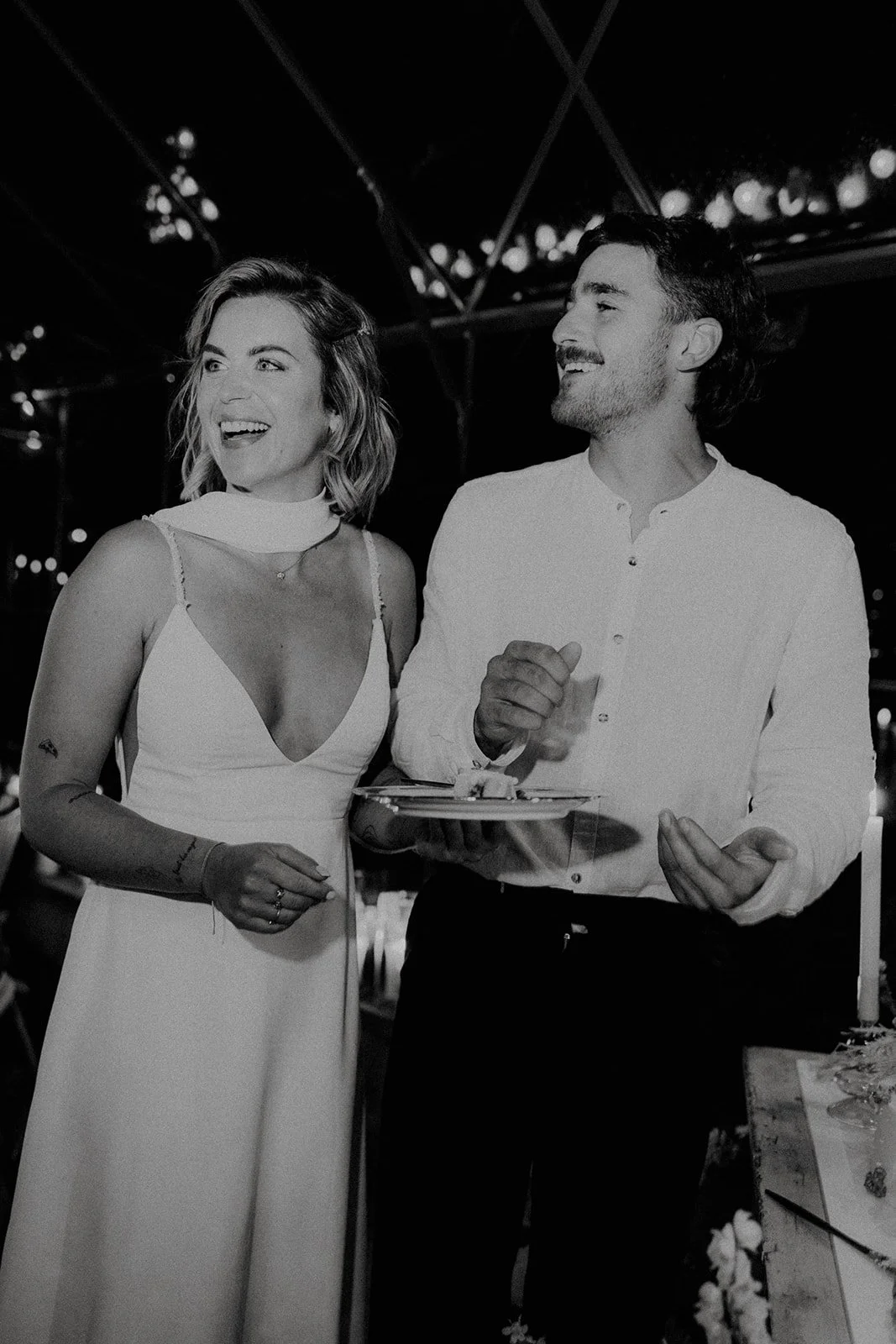 Un couple en noir et blanc, dans un décor naturel, probablement lors d'un mariage. La femme porte une robe blanche avec des détails en dentelle et tient un bouquet. L'homme porte une chemise blanche et un pantalon foncé.