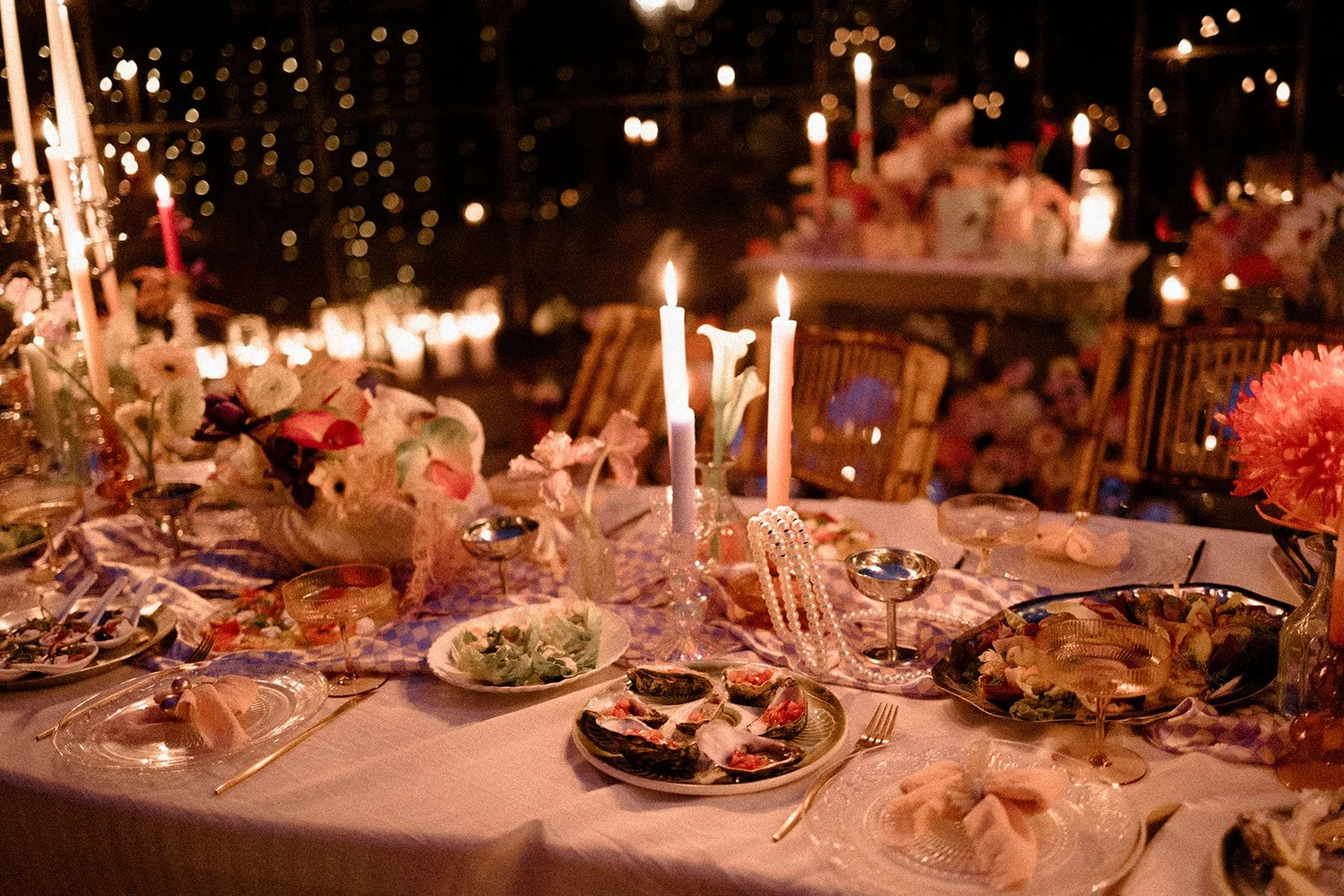 Table élégamment dressée avec des bougies, des fleurs et divers plats raffinés, ambiance romantique et chaleureuse avec des lumières tamisées.
