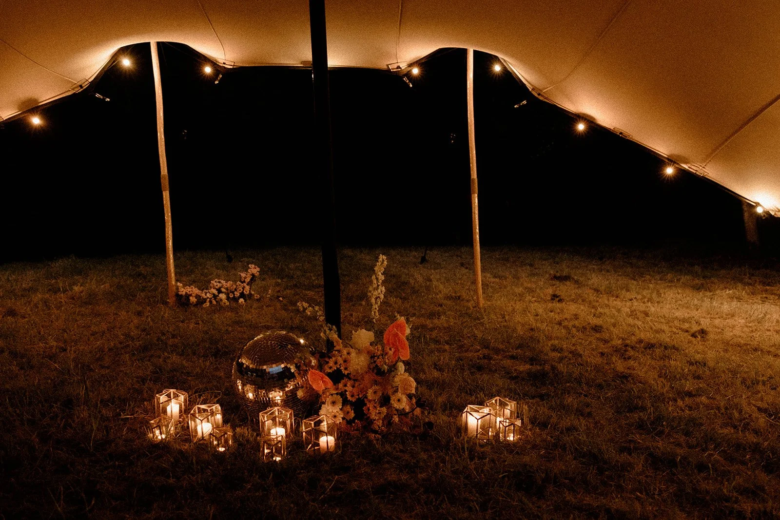Un intérieur de tente éclairé avec des lanternes, des fleurs et une boule disco sur le sol.