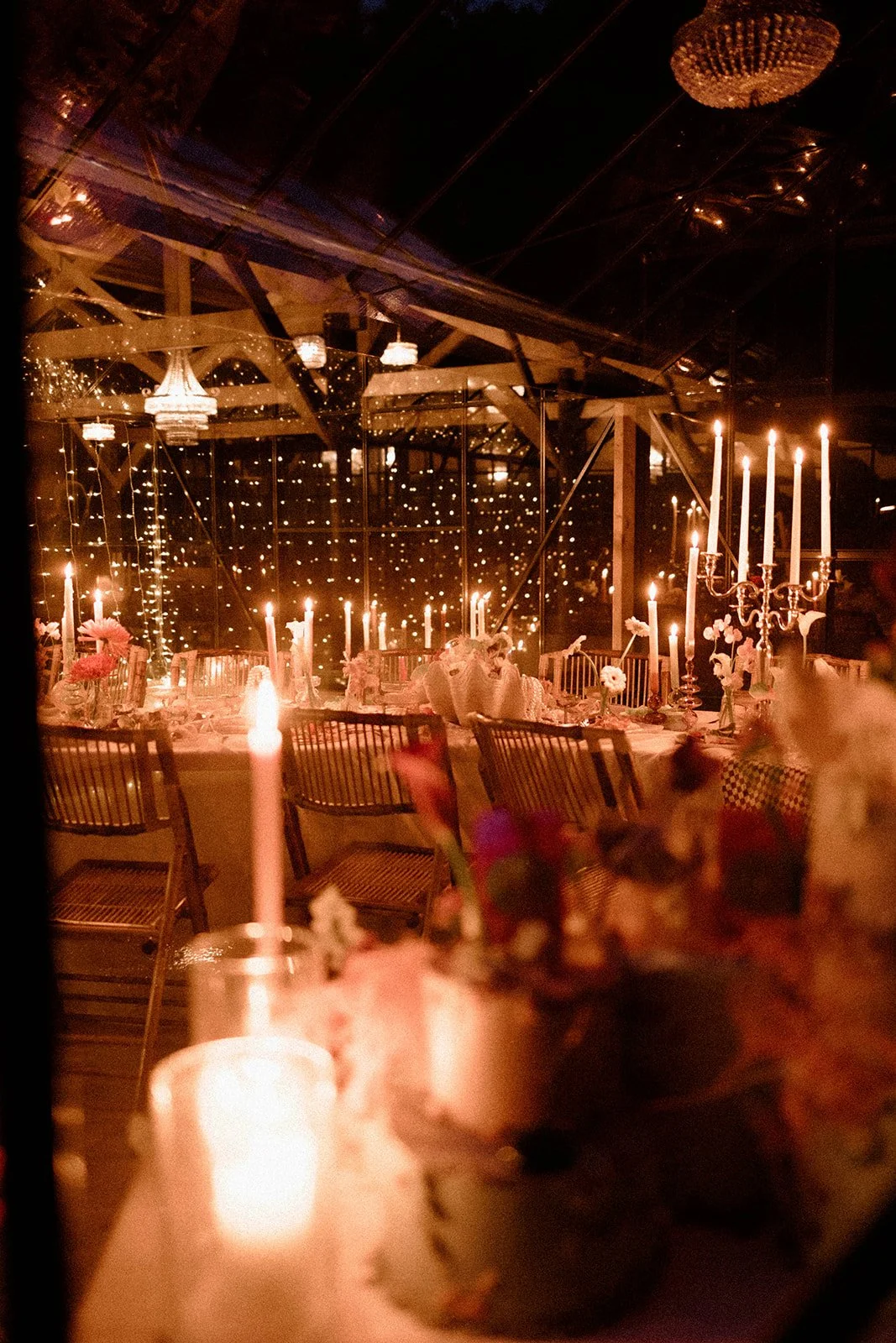Serre décorée avec des lumières et des bougies pour un événement nocturne.