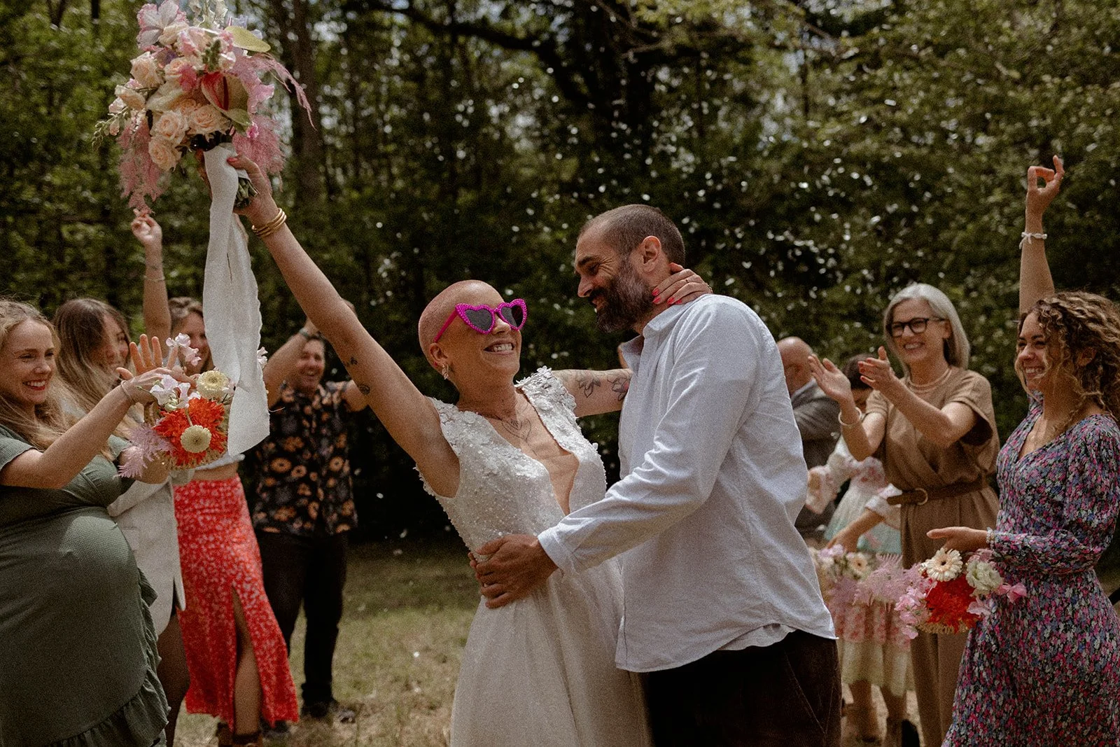 Un couple célèbre leur mariage entouré d'amis et de famille. La mariée porte des lunettes de soleil roses en forme de cœur et tient un bouquet. Il y a une ambiance joyeuse et festive en plein air.